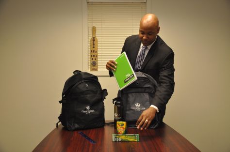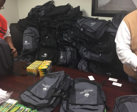 Attorney Frank Walker Stuffs the first Back to School Backpack
